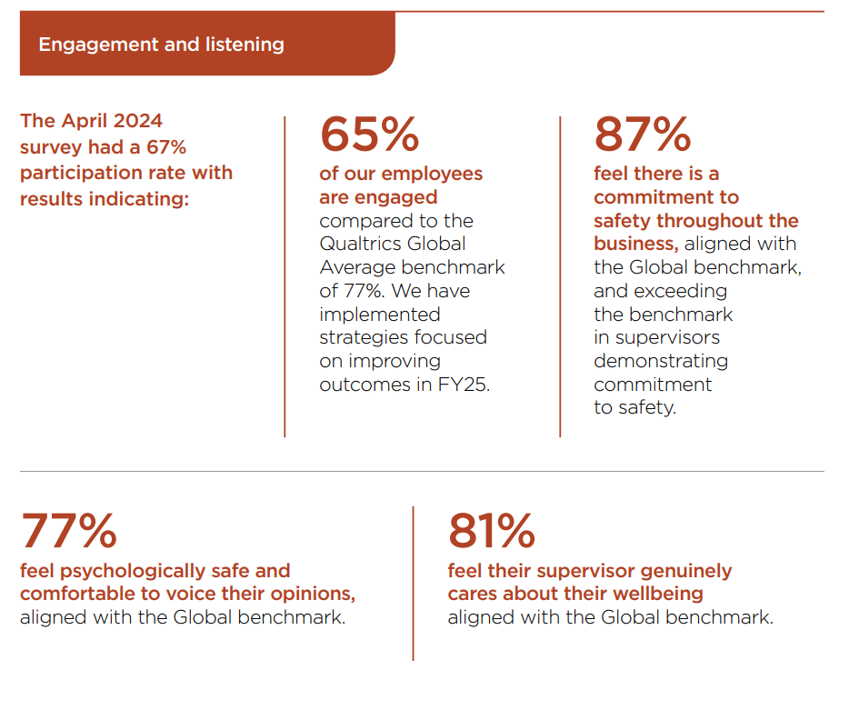 We measure employee engagement through the biannual Your Voice engagement survey which was implemented across our business in FY24 following a successful FY23 pilot. The April 2024 results indicate that 65% of our employees are engaged compared to the Qualtrics GlobalAverage benchmark of 77%. Some results, such as Engagement levels, that were below Global benchmarking can be attributed to FY24 being the first year of the survey being implemented across Evolution, and the ‘Neutral’ responses of our people. This indicates we have opportunity to continue maturing our awareness and use of this still relatively new tool year-on-year. FY24 will serve as a baseline survey with results presenting clear actions across the business to increase employee engagement, particularly concentrated on career development.
